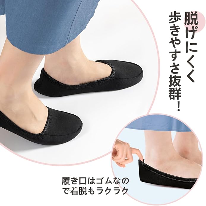 2.快適な履き心地:伸縮性のある履き口で足にフィット。柔らかく厚みのあるインソールで、足が痛くなりにくい。かかとまでカバーして脱げにくい設計。