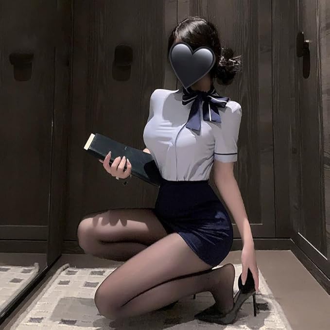 【シーン】:シンプルで清涼感のあるブルーのシャツとネイビーのミニスカートのセットアップが、優雅な雰囲気を醸し出します。襟元のタイイングリボンデザインは、可愛らしさと上品さを兼ね備えています。コスプレイベント、パーティー、写真撮影会など、さまざまな場面で目を引く一品となるでしょう。
