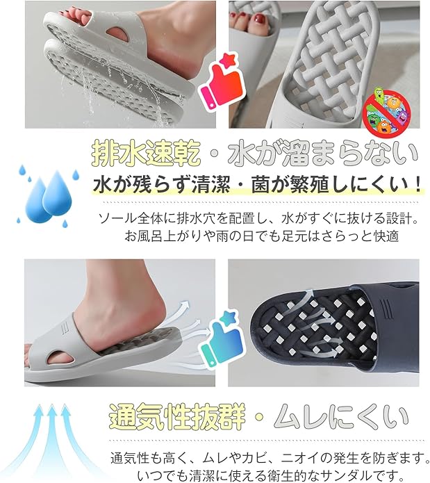 【穴あきで排水&快適】開孔デザインで水が溜まらない→雨や浴室でも安心。すぐ乾く軽量設計+通気性抜群でムレ防止!