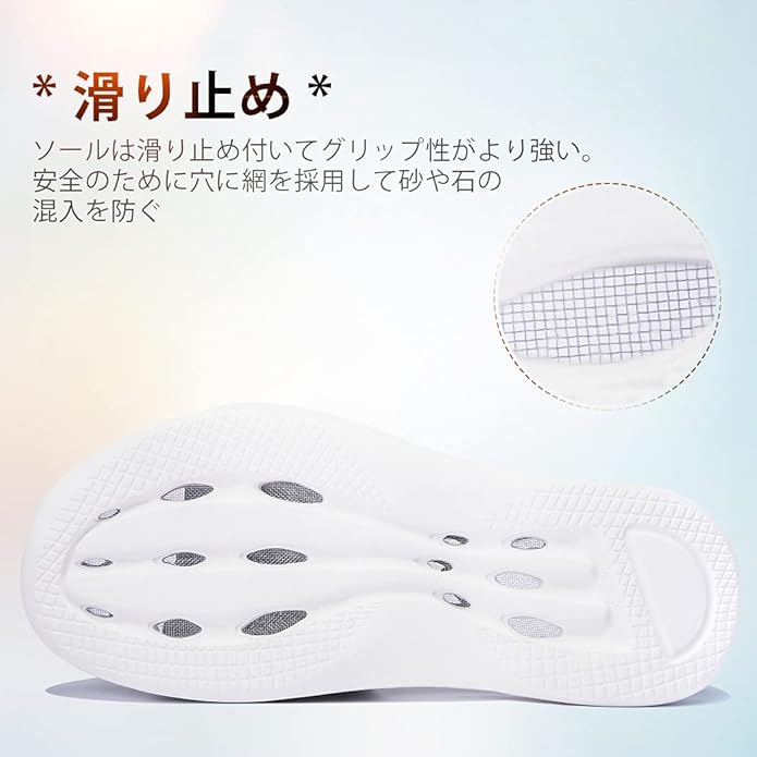 【水切り】穴あきソールのタイプで、水が入った時すぐに排出でき、乾きやすくて防臭衛生で、ずっと爽やかさを与えます。