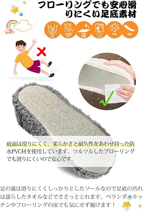 ❄【2023年改良版滑子供 スリッパ】【り止めソール・防音設計・防水性】りにくく、柔らかく消音タイプで床にも優しいPVC素材の裏底。子供 スリッパのソールはゴム素材で濡れた床を歩いたとしても、靴中に水が染みることはありません。さらに、底面が滑り止めに加工されて板の間も廊下も傷もつかず、安心して家中どこでも履き続けられます。丈夫で耐摩耗にも強くて、長くご利用できます。