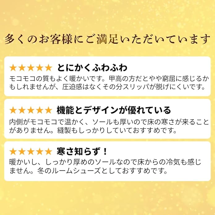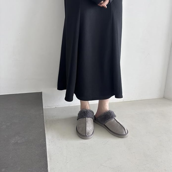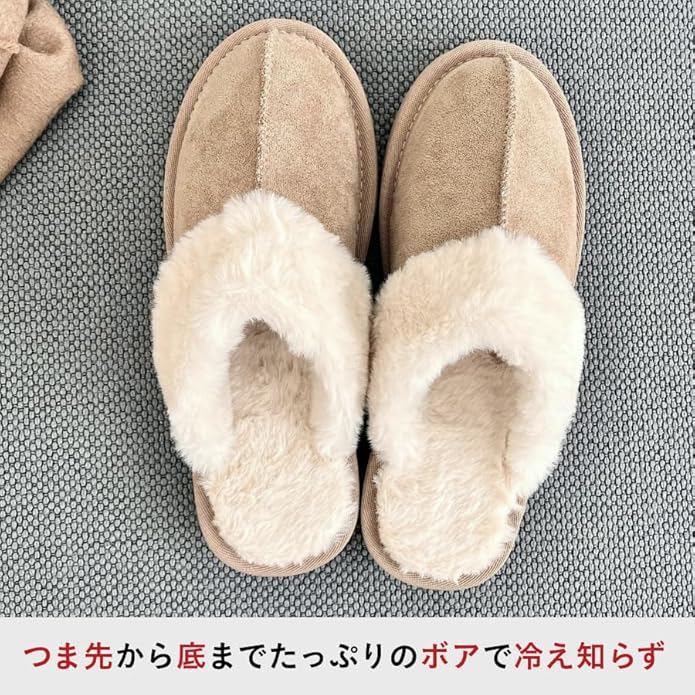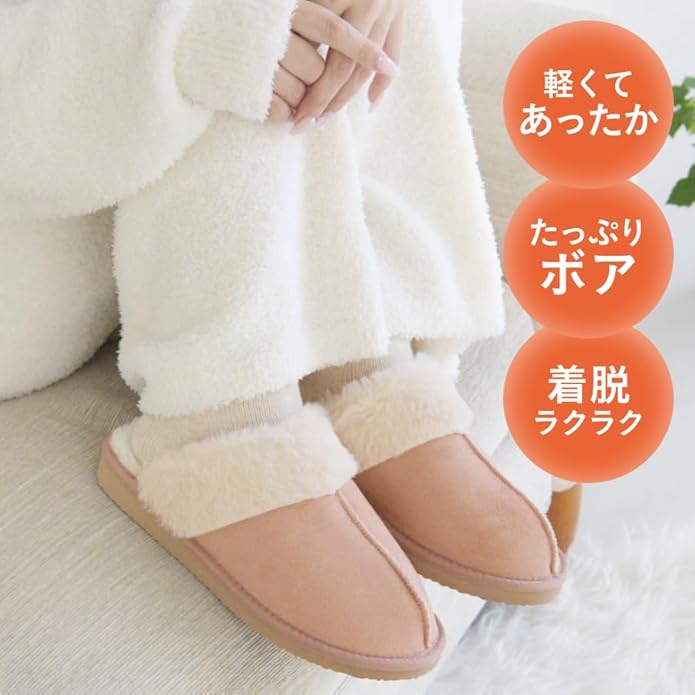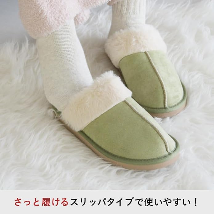 フェイクファーの肌触りが優しく、つま先まで隠れるスリッパタイプで室内も快適に過ごせるアイテム。