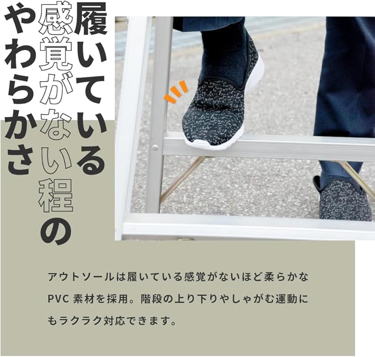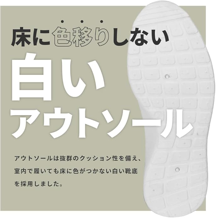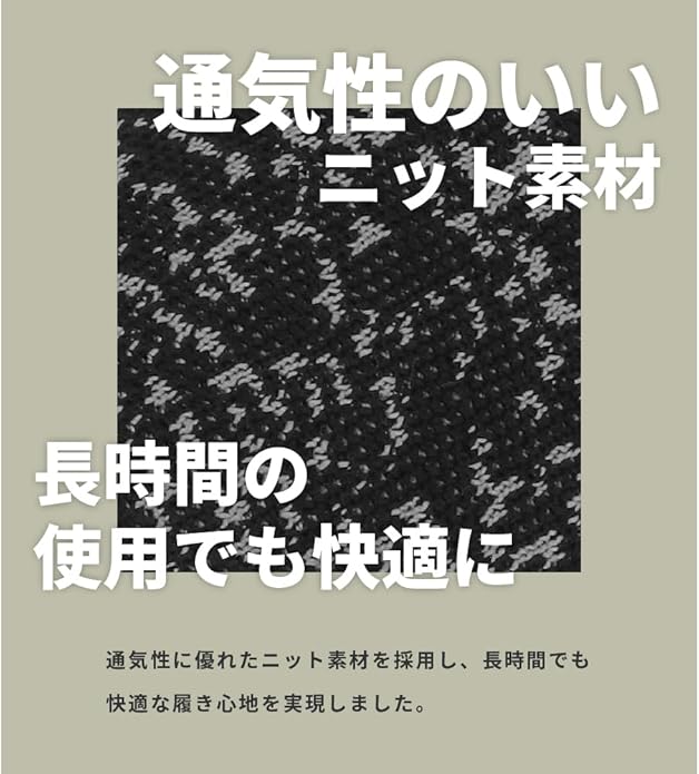 ニット素材で通気性がよく、柔らかでラフな履き心地の軽作業靴。履いている感覚がないほど柔らか。かかとを踏んで履いても型崩れしないように補強もしてあります。室内作業で床に色がつかない白い靴底を採用。