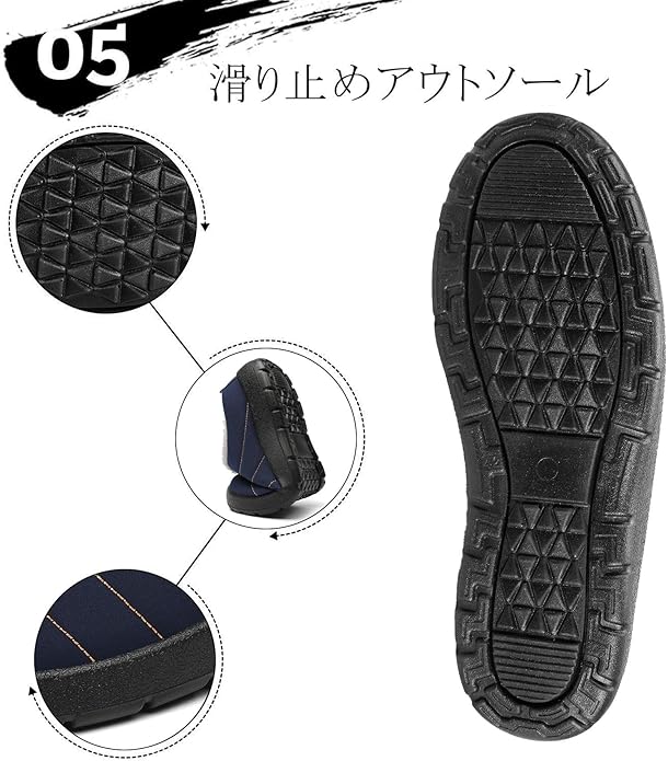 滑り止めアウトソール: アウトソールには二重滑り止めのゴム素材より出来ており、底部にも独特の滑り止めデザインが採用され、地面をガッチリクリップでき、心強く履いて頂けます