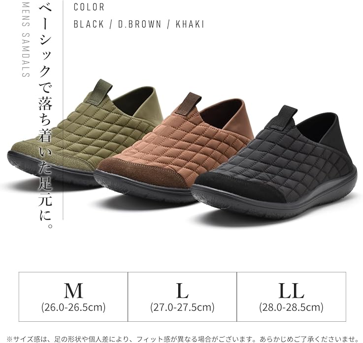 【 サイズ感 】サイズ目安 M(26.0~26.5cm) L(27.0~27.5cm) LL(28.0~28.5cm) 標準的なつくりです。普段のスニーカーサイズをおすすめしております。足の形状や個人差によりフィット感が異なる場合があります。あくまで目安程度とお考えくださいませ。