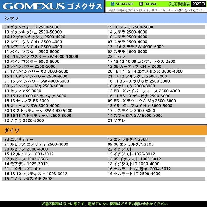 【対応機種】シマノ、ダイワリールの一部。お手持ちのリールと対応表をご確認頂き、お好みのカラーをお選び下さい。機種について、お分からない場合は是非お問い合わせください。★ご注意:1000‐2000の機種の装着部が短くて、脱落する恐れがありますので、おすすめいたしません。19 セルテート 5000に対応できません