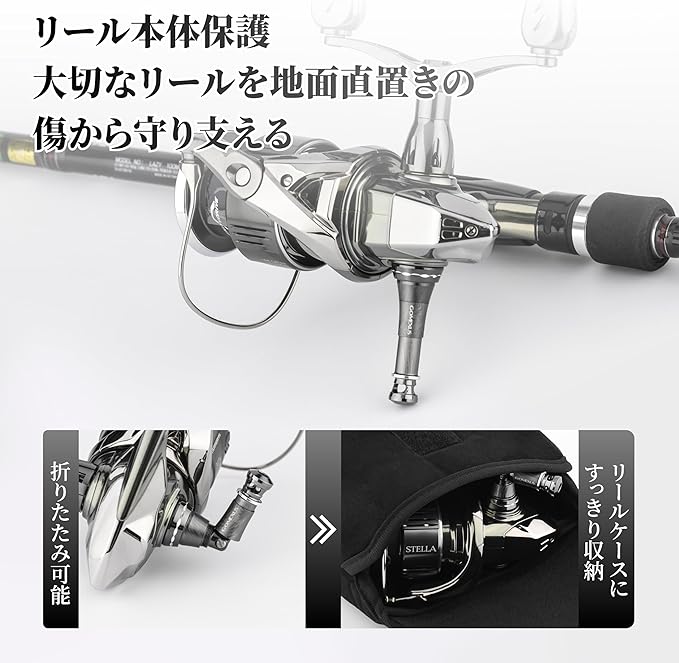 【ボディーキーパー機能】 ★リールを地面置きの傷から守り支えます★魚との激しい戦い時にリールとの衝突を軽減します★フック掛け穴があり、揺れによる傷を防ぎます★リールのバランスを保ちます