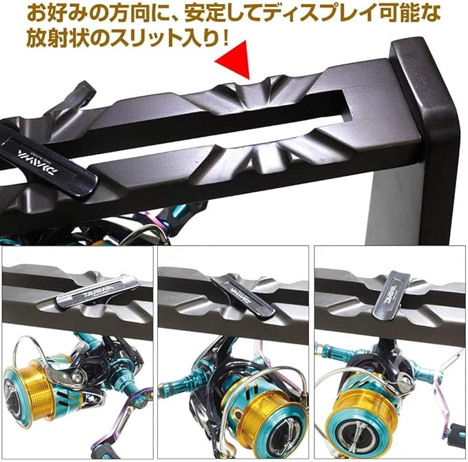 様々な スピニングリール に適合。角度も自分の好みに合わせて3段階で変えられるので、ハンドルやスタンド等を見えるようにディスプレイすることも可能(※大型 リールなど入らない場合や、隣のリールに干渉してしまう場合もございます。十分ご注意ください。)