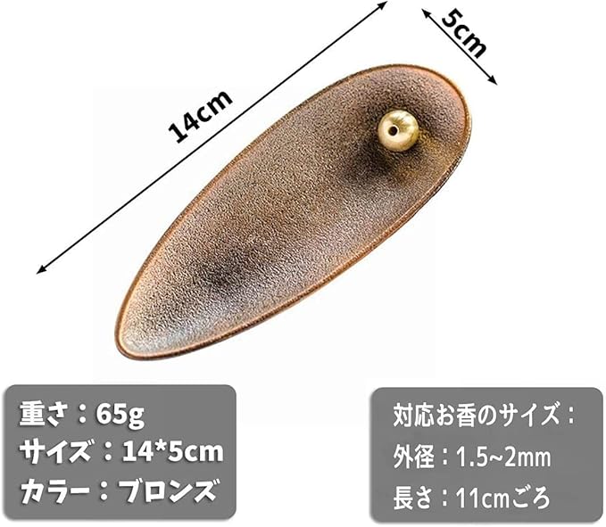 【角度調整できるお香受け構造】 お香を差し込む玉受け部分には溝付きで、挿しやすく、灰が飛び散りにくい安心設計。直径約3mmの穴を採用し、市販のお線香(最大約13cm)にピッタリ対応 。 長さ14cm 幅5cm 高さ1cmとサイズです。