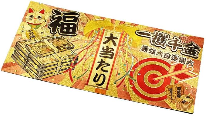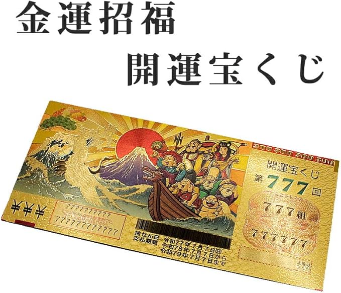金の宝くじとは・・・金運を呼ぶ実物サイズの金の宝くじです。 この宝くじはプラスチックに表面アルミ・エッジング加工を施してあり豪華に輝いています♪ お財布や宝くじ入れ、金庫に入れて金運を上げるお守りとして、また観賞用としてお使いください。 縁起物としてプレゼントにも大変喜ばれます。