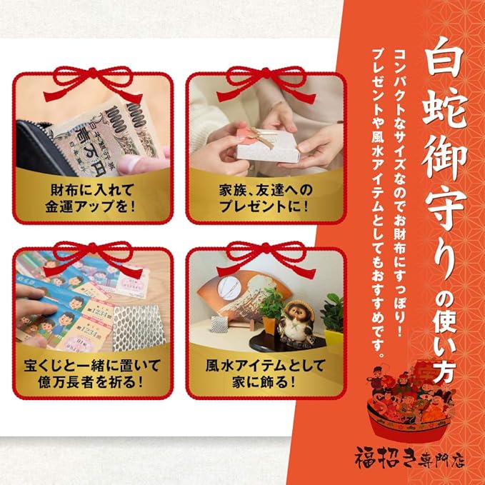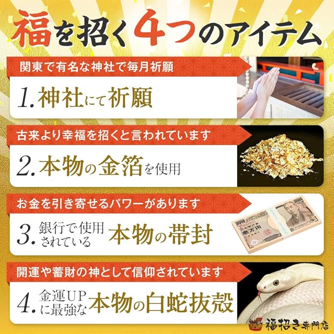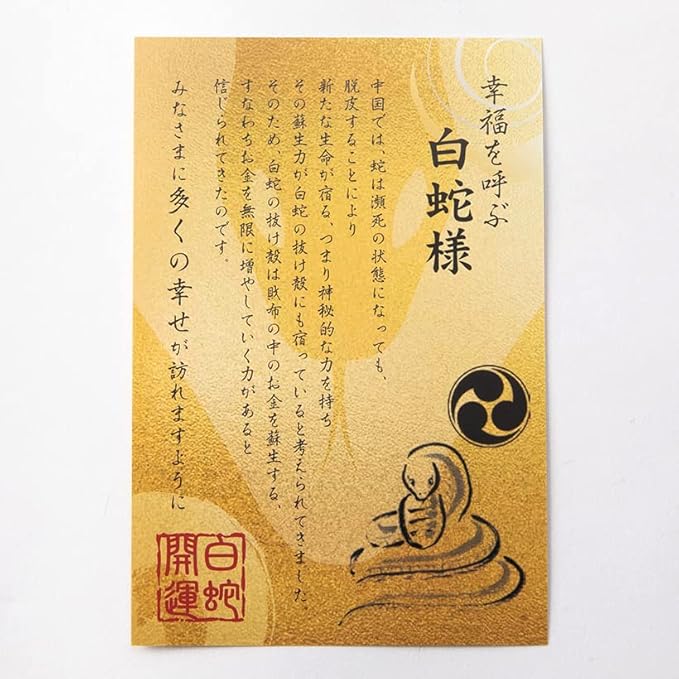 ★神社にて祈願済みグッズ★ サイズ 約6 9.5cm 帯は実際に銀行で使われている本物です。その上に金箔が散りばめらています。本物の白蛇抜殻もついていますので金運アップが期待できます。 ご朱印風カード付き サイズ 10 15cm 白蛇は幸運を呼ぶ守り神と言われ、また「蓄財の神」「弁財天の使い」として古くから知られています。 日本各地に白蛇を祭る神社も多く、「金運に縁起が良い」と多くの民衆から信仰を集めてきました。 さらに中国では蛇は瀕死の状態になっても脱皮することにより新たな生命が宿る、つまり神秘的な力を持ちその蘇生力が白蛇の抜け殻にも宿っていると考えらています。 財布の中のお金をを蘇生する、すなわちお金を無限に増やしていく力があると信じられています。