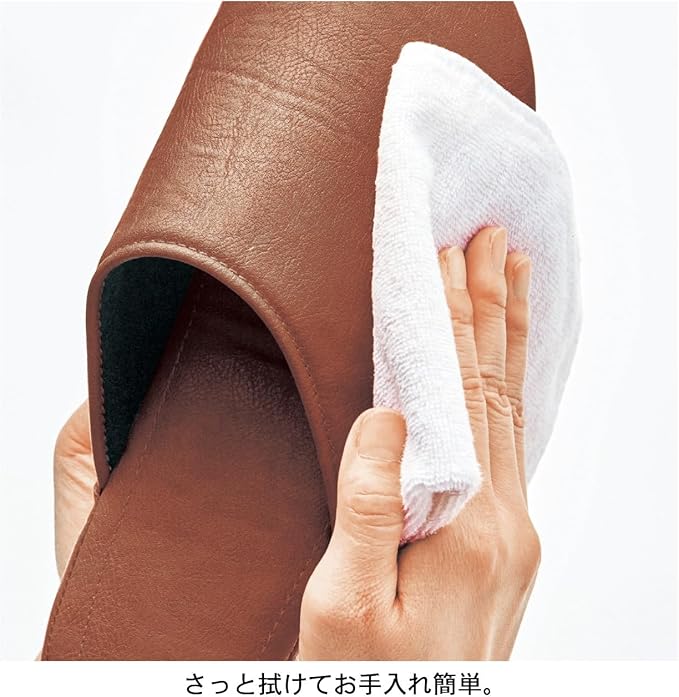 汚れが拭けるから、キッチンや水回りにも ●今までありそうでなかった、合皮のシックなスリッパ ●汚れがついてもサッと拭き取れいつもキレイに保てます ●キッチン使いにうれしい ●色ムラやシワの質感が、高級感のある雰囲気 ●裏面はすべりにくく足音も控えめ ●甲が合皮でさっと拭いてお手入れでき、トイレ用のスリッパとしてもおしゃれ。 ●ペットの抜け毛がつきにくい合皮素材を使用 ●粗相をされても気兼ねなく洗濯機で洗える