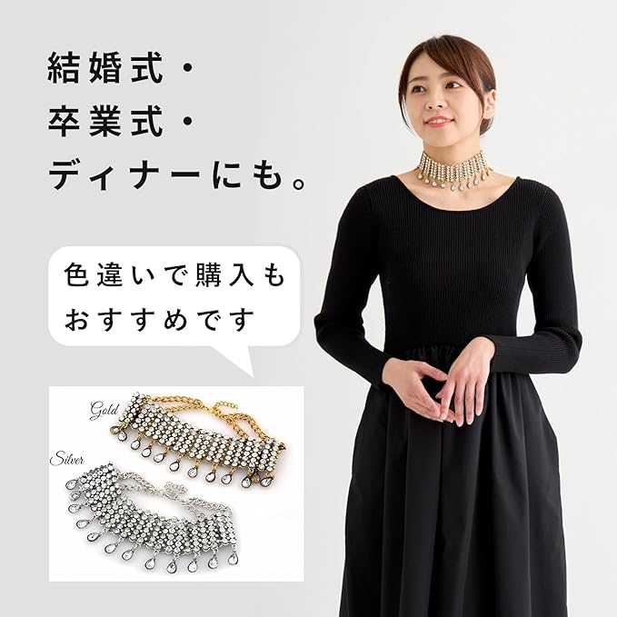 【1秒でドレスアップ】シンプルなワンピースやドレスも、着けるだけで一気に華やかなパーティースタイルへ。デコルテを埋め尽くすクリスタルの輝きが、レフ板効果で表情まで明るく魅せます。