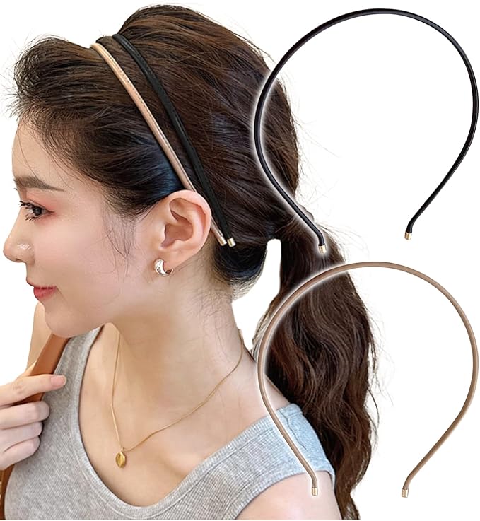 [Herbeluemily] カチューシャ ヘアバンド フェイクレザー 細目 おしゃれ 大人カジュアル シンプル 韓国風 2個セット B ブラック+ミルクティー HM-0124-R03-setB