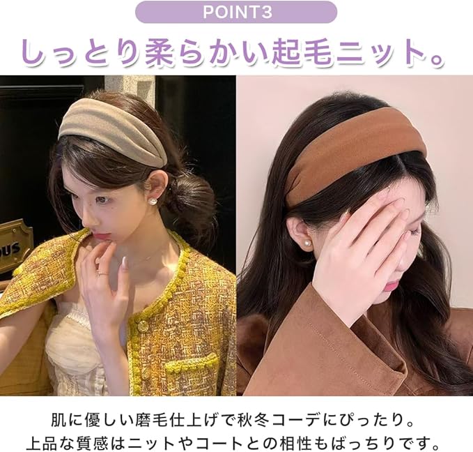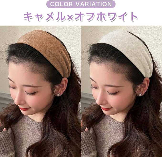 幅広 カチューシャ 太め ヘアバンド ニット 起毛 フンワリ 小顔 洗顔用 ヘアアクセサリー ズレにくい 痛くない くすみカラー 秋冬 韓国 大人可愛い レディース No81 キャメル オフホワイト
