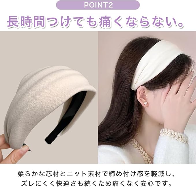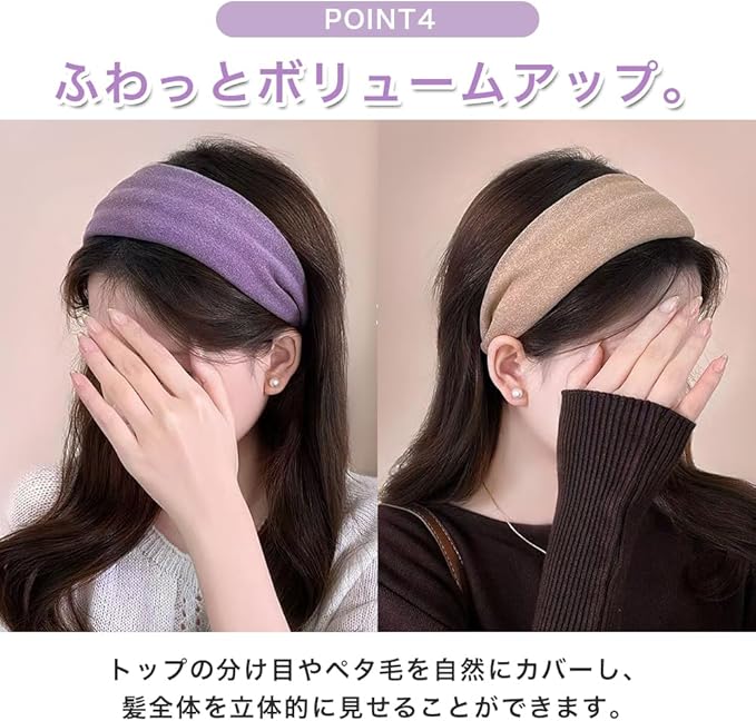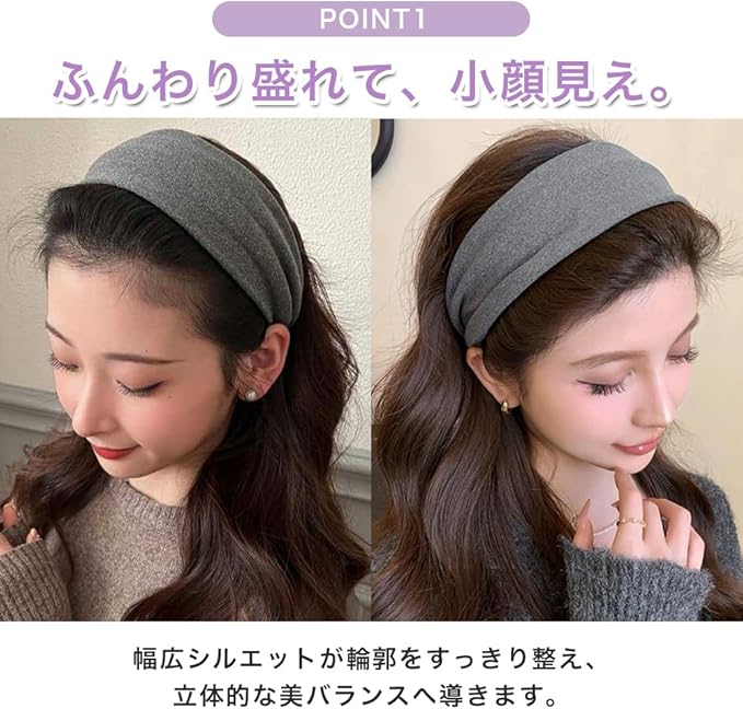 【小顔見えを叶える幅広デザイン】太め・幅広カチューシャが頭頂をふんわり盛らせ、輪郭をすっきり見せる小顔効果を発揮。分け目や生え際が自然に隠れるため、どんな髪型でも美バランスに整います。