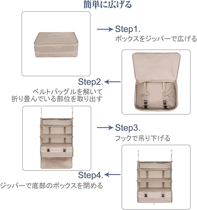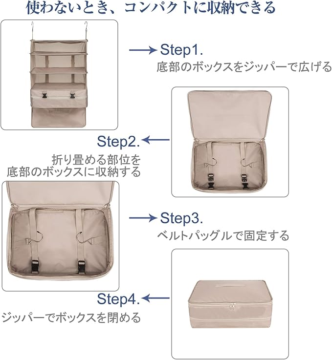 TABITORA(タビトラ)収納ボックス 吊り下げ インナーバッグ 衣類ラック 収納 旅行 出張 クローゼット 省スペース 大容量 衣装ケース 4段 オーガナイザー ベージュ XL-A
