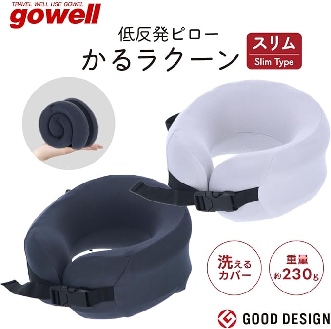 Gowell ゴーウェル 低反発 ネックピロー かるラクーン スリム | 低反発ピロー 車中泊 キャンプ アウトドア ドライブ 車 電車 新幹線 飛行機 機内 在宅 昼寝 旅行用品 旅行グッズ トラベル トラベルグッズ (ライトグレー)