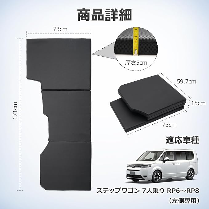 3.【車中泊快適 ・段差解消・様々な用途】「旅行や仕事の長距離の移動中に横になって休みたい」そんな願いを叶えてくれる、 ステップワゴン RP系 7人乗り 専用の車中泊マットです。厚みは約5㎝で、サッと広げてどこでも寝られます。シートの段差を一発解消するの車中泊グッズ!室内あるいはアウトドアの場合には、ソファ、ベッド、テント寝台として使用できます。レジャー、ドライブ、防災など幅広くご使用いただけます。旅行などの景色で車中泊してベッドにすることもできます。車内全体がベッドとして使用したい人は、左側用マットと右側用マットの両方を購入することをおすすめ~