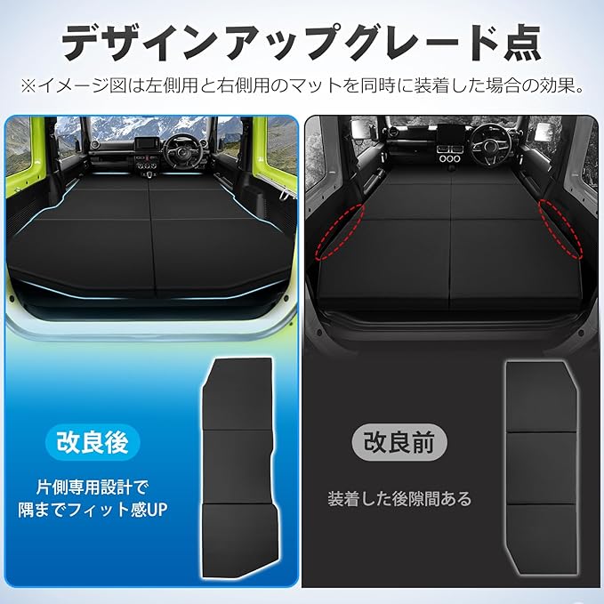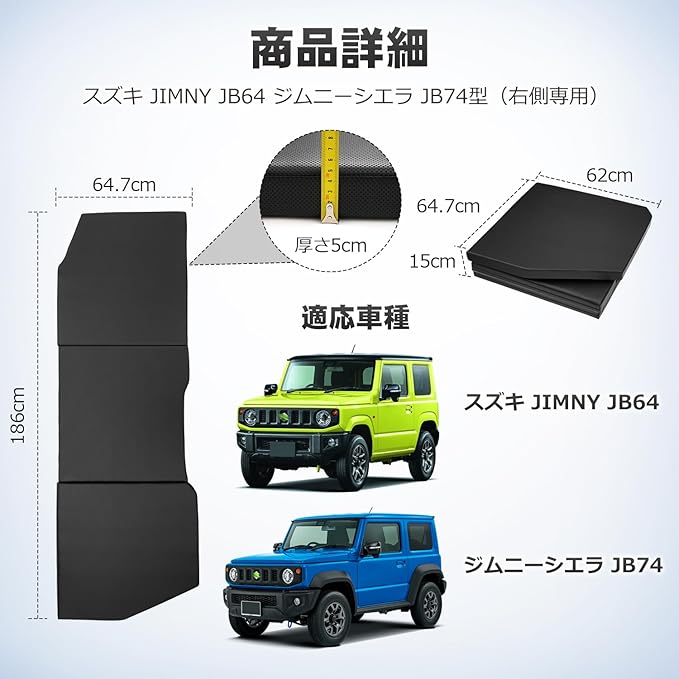 1.【適合車種】:スズキ JIMNY JB64 ジムニーシエラ JB74型(AT/MT対応)。※注意※ヘッドレストまたはシートクッションを取り外して前席の位置をもっとフラットできます。年式:2018年7月-現行(H30年7月~現行)。【セット内容】右側用(運転席用)マットx1p。※左右の車中泊マットの形状が若干異なるため、汎用的に使用することができません。※左右側用のマットを一緒に購入したい場合は、お問い合わせください。