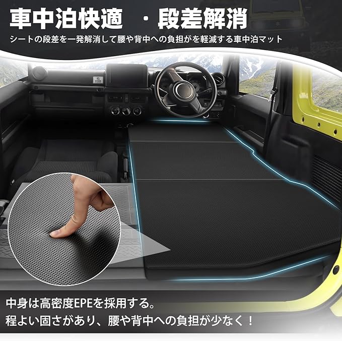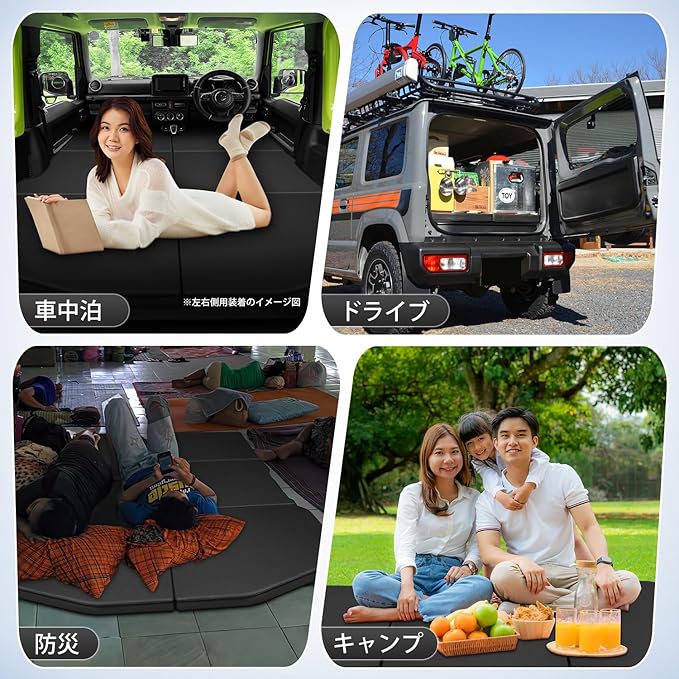 3.【車中泊快適 ・段差解消・様々な用途】「旅行や仕事の長距離の移動中に横になって休みたい」そんな願いを叶えてくれる、 JIMNY JB64 JB74型 専用の車中泊マットです。厚みは約5㎝で、サッと広げてどこでも寝られます。シートの段差を一発解消するの車中泊グッズ!室内あるいはアウトドアの場合には、ソファ、ベッド、テント寝台として使用できます。キャンプ、レジャー、ドライブ、防災など幅広くご使用いただけます。旅行などの景色で車中泊してベッドにすることもできます。車内全体がベッドとして使用したい人は、左側用と右側用を購入してください。