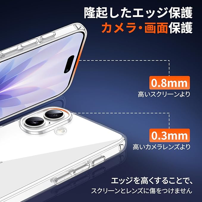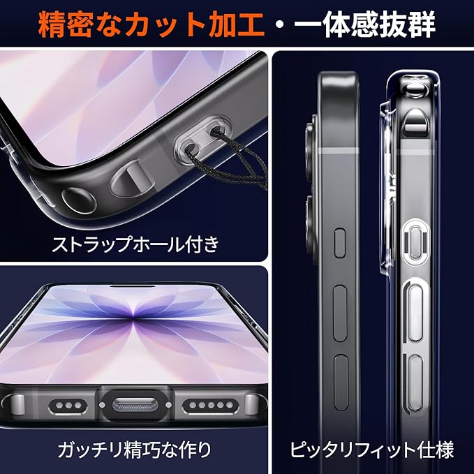 【絶妙バランス・快適操作・ワイヤレス充電に対応】クリアケースの保護性能を保ちながら、スマートさを損なわないよう、薄さと強度のバランスを取り、手にフィットする程よい厚みで、快適さが保ち、最適な設計で作り出す。スマホのボタンやレンズなどの細部に基づいて設計された専用スマホケースは、ぴったりとフィットしています。ボタン、カメラ位置も含めて寸法はバッチリでスマホケースをつけていないかのように快適に使用できます。背面は放熱性良いポリカーボネート素材で、熱を効果的に放散し、バッテリーにとても優しいです。ケースをつけたままワイヤレス充電可能です。