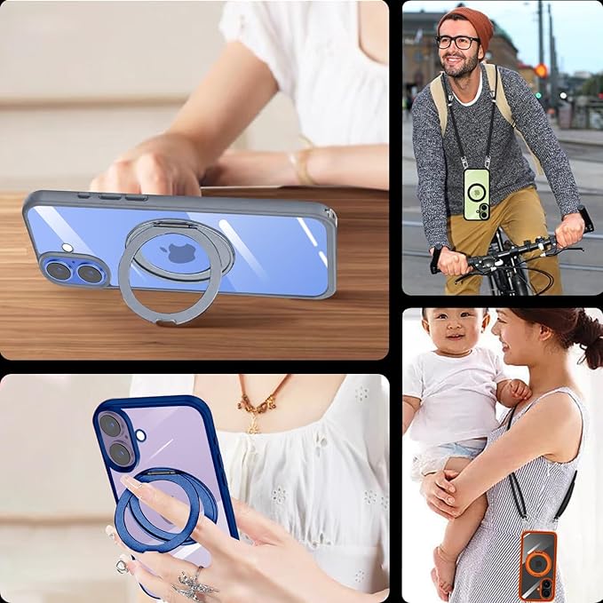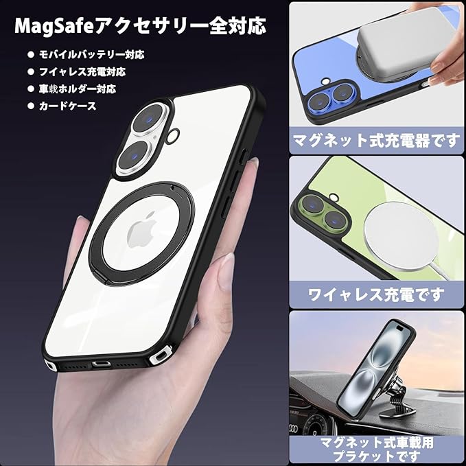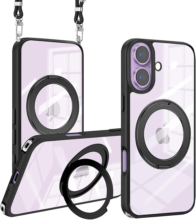 For iPhone 17 用 ケース クリア ショルダー 多機能360度回転スタンド MagSafe対応 調節可能 ストラップ付き ワイヤレス充電 耐衝撃 カメラレンズ保護 いphone17 対応 マグセーフ マグネット搭載 透明 PC + TPU 肩がけ 首掛け 紐付き 耐衝撃 全面保護 おしゃれ アイフォン カバー (ブラック)