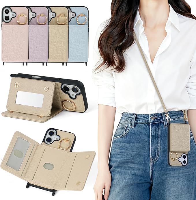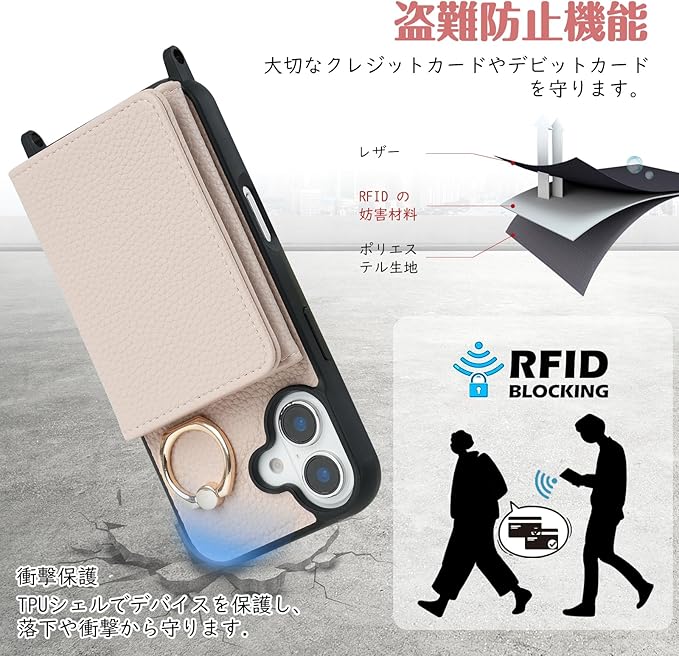iPhone 17 ケース 手帳型 iPhone17 スマホケース あいほん 17 財布型 携帯カバー アイフォン17 ケース ショルダーストラップ付き 耐衝撃 防盜機能 (カード収納/化粧鏡/リング付き) おしゃれ 可愛い 女性向け 斜め掛け 背面収納対応(アプリコット)