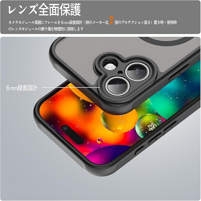 【素材・デザイン】本製品は、高硬度PC素材のベースプレートと高靭性強化TPU素材のフレームを組み合わせ、ハイブリッド技術と精密金型成形で製造。ケースとスマホ本体の全てのポート位置が精密に合致し、ボタン部分のくり抜き設計により、装着時でも操作感を損なわず快適に機能をお使いいただけます。