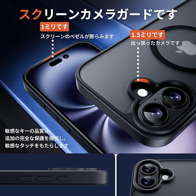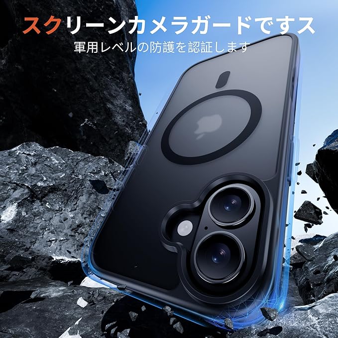 【落下の不安をゼロに!・MIL 規格対応】頑丈なPC背面と柔軟なTPUフレームを採用し、四隅にエアクッションを配置したデザインで、防塵、防傷、滑り止め衝撃吸収に優れ、日常使用に対する確かな保護を提供する iPhone スマホケース です。また、液晶画面より1.2 mm、カメラレンズより1.5 mm高い高低差設計を採用し、カメラ周囲を完全に覆うレンズ保護設計で、スマートフォン本体を徹底的に守ります。平面に置いてもうっかり落としてもスマートフォンを保護できる iPhone 17 カバー です。