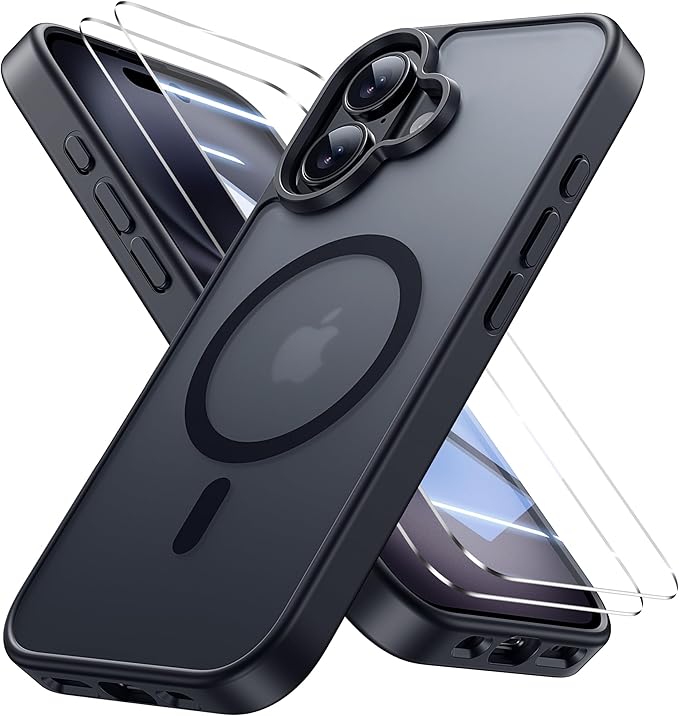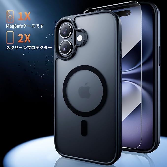 iPhone 17 用 ケース【強化フィルム2枚付き】Magsafe対応・米軍規格 いphone17 スマホケース 半透明 耐衝撃 指紋防止 滑り止め マグネット搭載 ワイヤレス充電 耐久性 黄ば 全面保護 あいふおん17ケース 6.3インチ用,ブラック