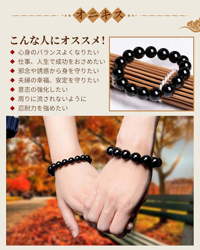 オニキスは自分自身の中心軸をしっかりと安定させる石で、着実に目標を実現するために地に足を着けた行動をするよう導いてくれる石です。また、人生において幾度も降りかかる辛い場面、苦しい 面においてもあきらめず、前に進むための忍耐力や意思の強さを与えてくれる石です。