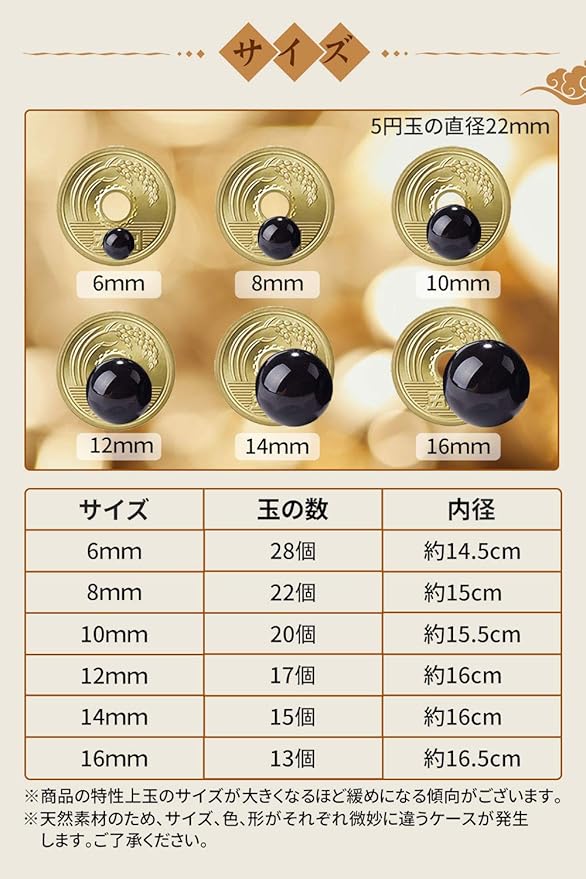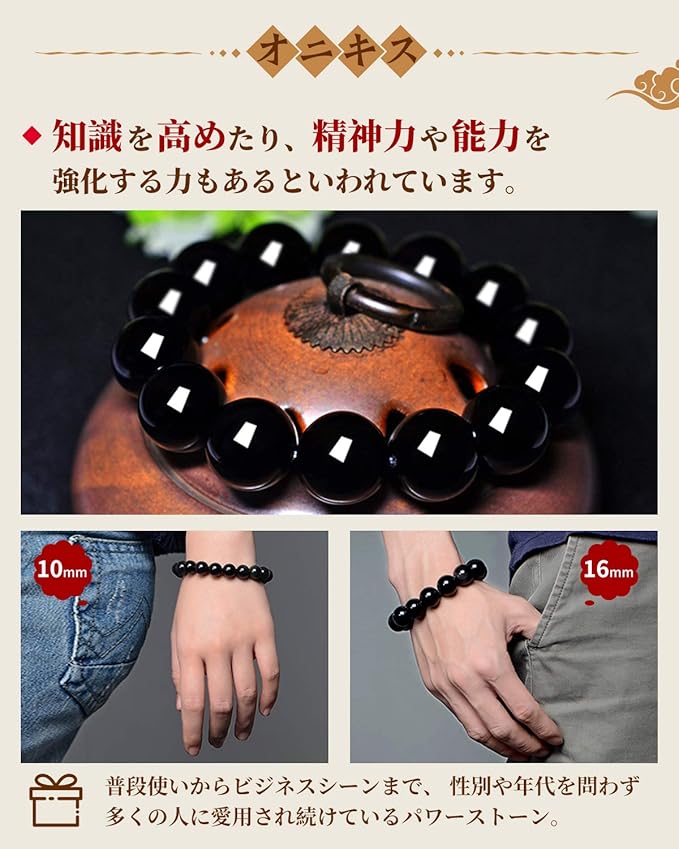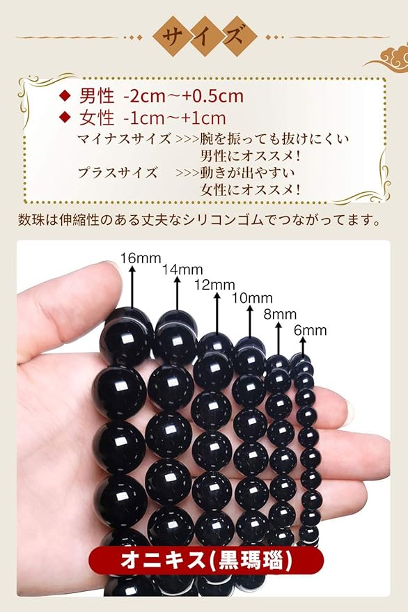 天然石種類:オニキス(瑪瑙) サイズは6mm・8mm・10mm・12mm・14mm・16mmの全6サイズ。サイズ:腕回り 約16cm( 0.5cm) ※サイズは多少誤差がある場合がございますので予めご了承ください。