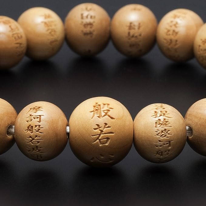 般若心経は仏教の教えを集約した経典で、読むことによって膨大な経典の大般若経600巻全てを読んだに等しい功徳が得られ、一切の苦厄が取り除かれるといわれています。なめらかな肌触りの柘植は付け心地が抜群で、使い込むほどに深い質感のある色になっていきます。