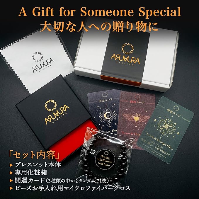 オリジナルセット内容:ブレスレット本体、専用化粧箱、開運カード(3種類の中からランダムで1枚)、ビーズお手入れ用マイクロファイバークロス