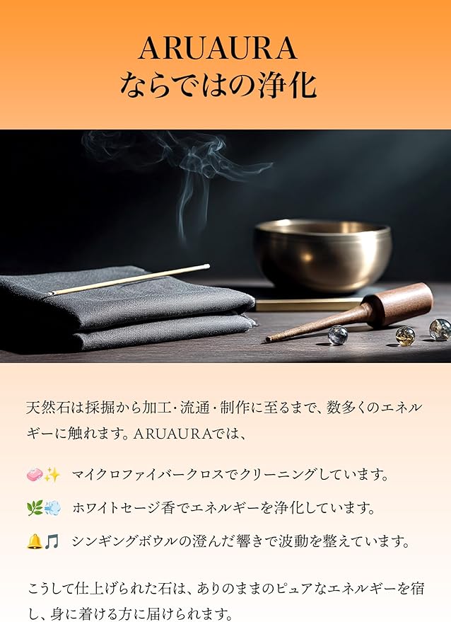ARUAURAでは、天然石を使用し、浄化プロセスを経た石を日本国内でひとつずつハンドメイド制作しています。(Made in JAPAN)
