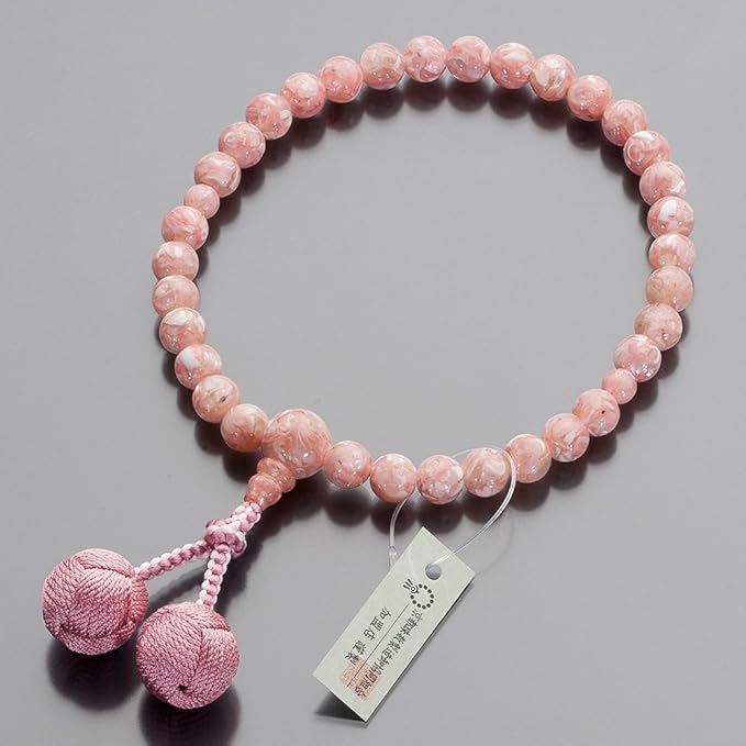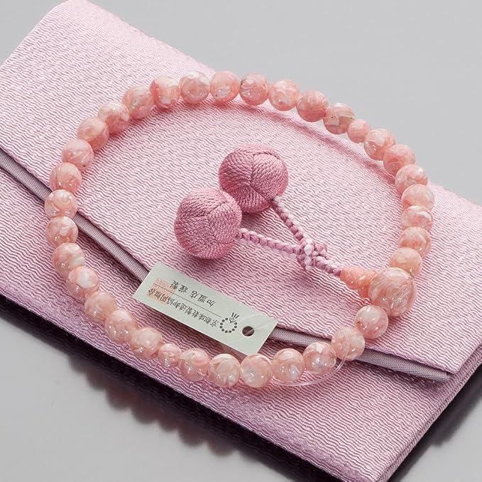 優しい色合いのピンクシェルを使用した女性用の念珠です。ピンクシェルは「馬蹄螺(バテイラ)」という貝を特殊な加工で仕上げた玉で、他の数珠とは一味違う、かわいらしくオシャレな雰囲気があります。表情豊かな美しい艶めきで、愛らしい魅力的な印象を演出してくれます。