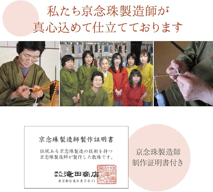 伝統ある「京念珠」だけが付けることを許される京都珠数製造卸協同組合のタグ付き。京都の数珠職人が匠の技で仕立てた逸品でございます。滝田商店限定商品品質の証である滝田商店発行「京念珠製造師製作証明書」付き。