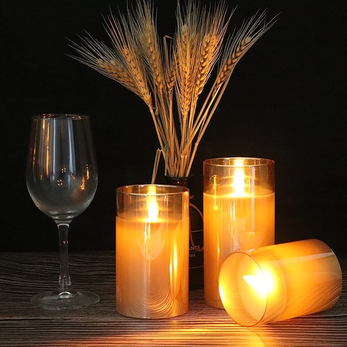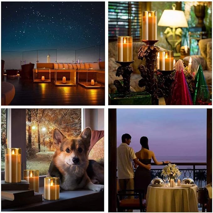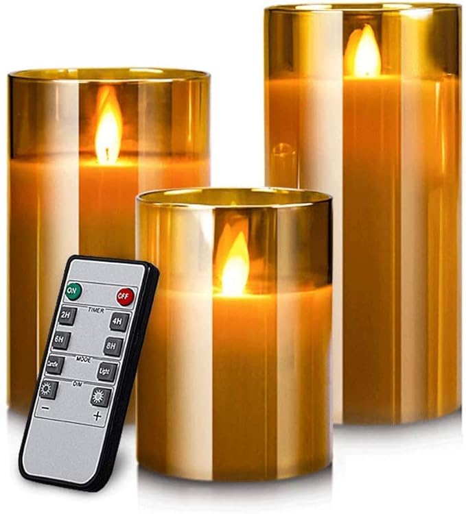 LEDキャンドルライト ledグラス ゴールド ロウソク 本物の炎のようにゆらめく3点セット 暖色光 火を使わない ゆらゆら揺れる 安全 省エネ 専用リモコン付き 明るさ調整 電池式 LEDライト キャンドル