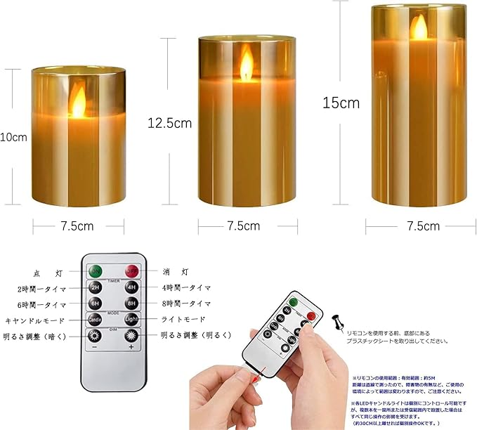 【使用便利】:1) 2本のAA電池(含まれていません)を各キャンドルのバッテリーハウスに入れてから、「オン」スイッチに移動します。2) IRリモコンを使って、タイマー機能などのキャンドルをコントロールできます。タイマーモード:2時間/4時間/6時間/8時間の自動消灯タイマー設定可, 1つのリモコンで距離が6M未満であれば、すべてのキャンドルをコントロールできます。リモコンにて点灯後タイマー設定をします。タイマー自動消灯した後、24時間後の同時刻に自動点灯され、前日と同じように同時刻に消灯いたします。【使用前にプラスチック片を抜いてください。リモコンの使用範囲は6メートルぐらいで、遮蔽物があればリモコンの使用効果に影響する可能性があります。また、リモコンは個別に点灯する1つのキャンドルを制御することができます。】