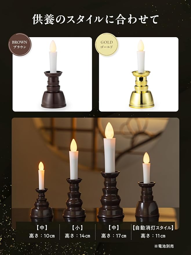 ✅(選べるカラー・サイズ・点灯時間) ブラウンとゴールドの2色展開。サイズは、ミニ(高さ約10cm・約60時間点灯)、小(高さ約14cm・約70時間)、中(高さ約17cm・約160時間)、自動消灯タイプ(高さ約11cm・約7分で自動オフ)の4種類をご用意。用途や設置場所に合わせて選べます。