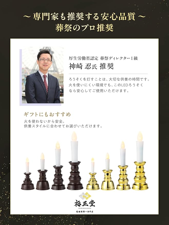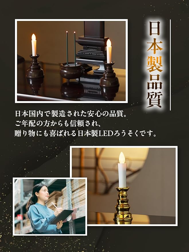 ✅(火を使わない安全な電子LEDろうそく)日本製 LEDの灯りで、火を使わず安心して供養ができるろうそくです。火災や煙の心配がなく、仏壇周辺に可燃物があっても安全。電池式でスイッチひとつの簡単操作。国内工場で製造された日本製で、品質にも信頼があります。