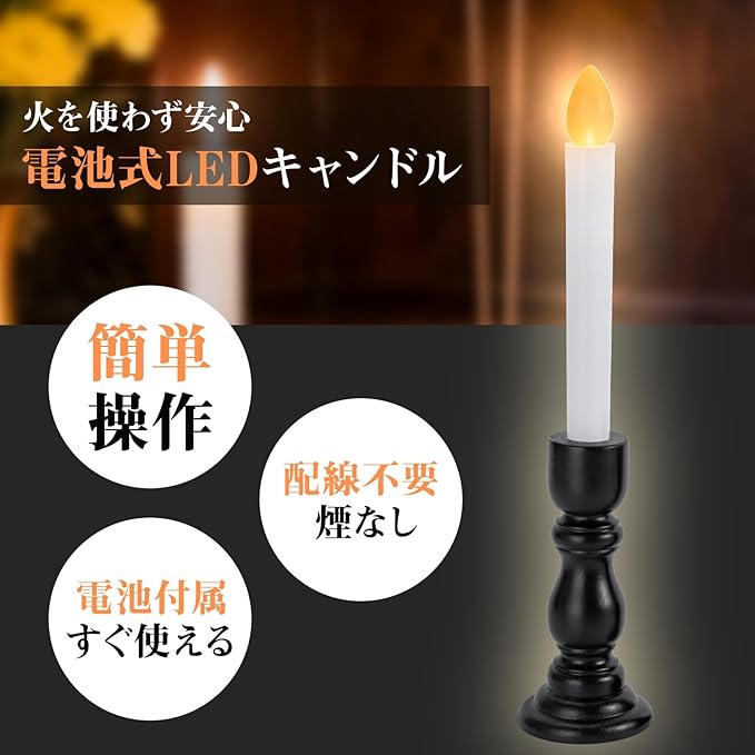 ✅【簡単操作・1年間安心保証付き】炎の先端を軽く押すだけのワンタッチ操作。ライターやマッチが不要で、どなたでも簡単に点火/消灯できます。このLEDローソクは、お買い上げから1年間の安心保証付きなので、万一の際もご相談ください。