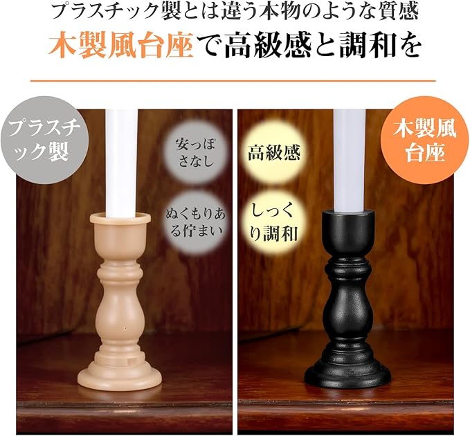 ✅【木製風台座で高級感と調和】プラスチック製とは一味違う、木製風台座を採用した仏壇用LEDローソク。高級感のある佇まいで、伝統的な仏壇やインテリアに違和感なく溶け込み、安っぽさのない上質な印象をお届けします。