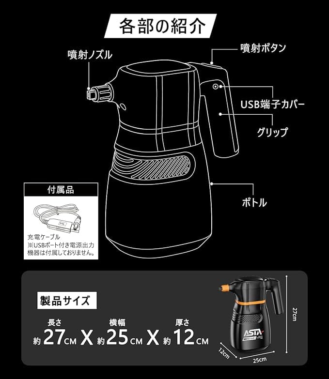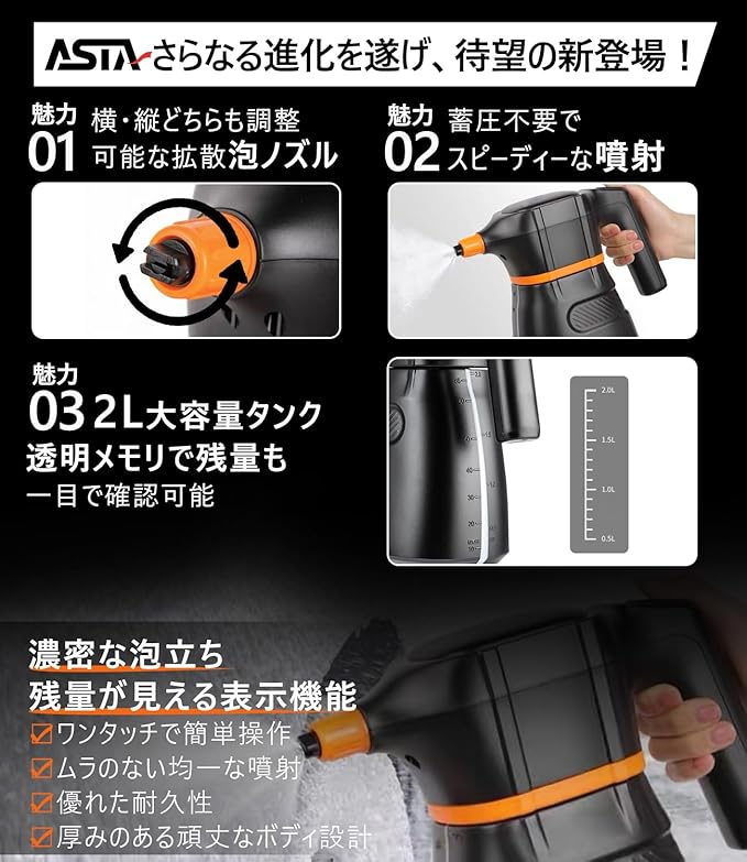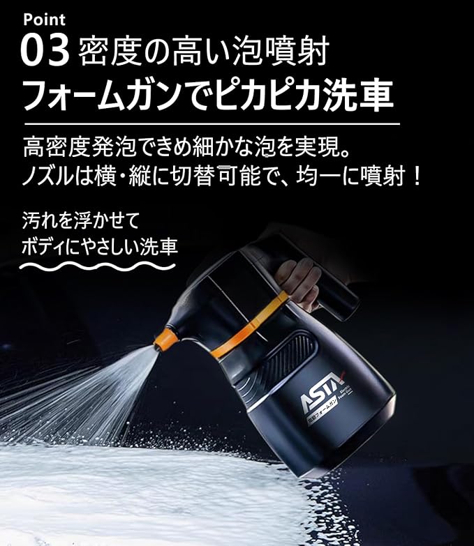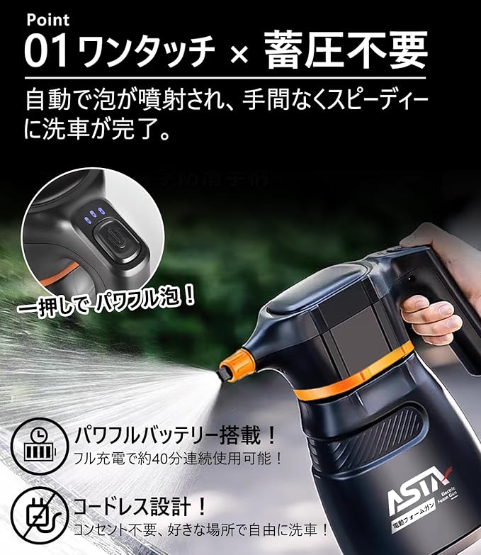 ASTA 電動フォームガン 洗車 充電式 コードレス泡スプレー 高圧対応 充電式フォームスプレー 洗車グッズ 車・バイク用 強力泡立ち