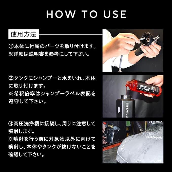 ☑フォームランスでの洗車を簡単にできるように、様々な仕様にこだわりのました。水量や、噴射角度、噴射範囲を細かく調整でき、車両の状態に合わせた濃密泡を噴射することが可能。また、ケミカル耐性の高い素材を採用しており、3pH洗車に対応しています。