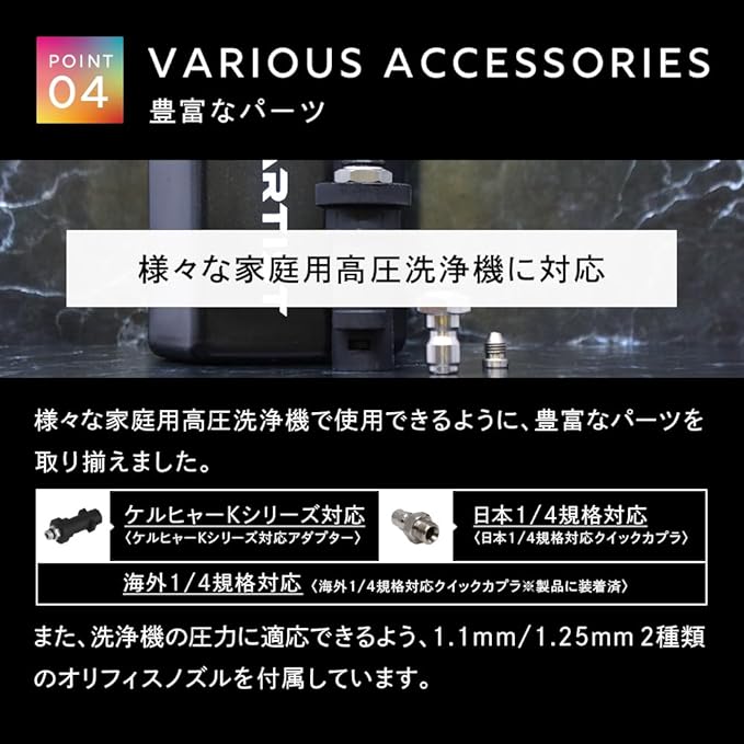 ☑様々な家庭用高圧洗浄機で使用できるように、豊富なパーツを取り揃えました。ケルヒャーKシリーズの接続パーツを筆頭に、海外1/4規格クイックカプラ、日本1/4規格クイックカプラを付属。また、洗浄機の圧力に適応できるよう、2種類のオリフィスノズルを付属しています。