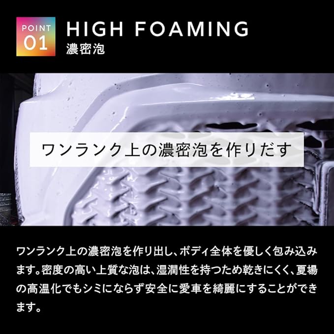 ☑ワンランク上の濃密泡を作り出し、ボディ全体を優しく包み込みます。密度の高い上質な泡は、湿潤性を持つため乾きにくく、夏場の高温化でもシミにならず安全に愛車を綺麗にすることができます。