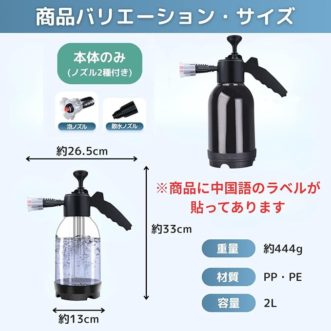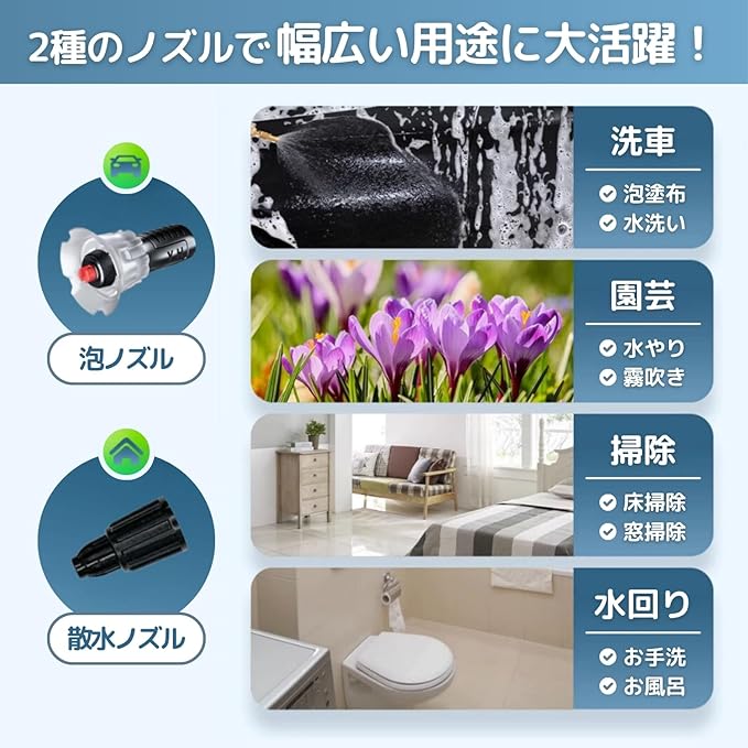 ✅ミニバン、ワンボックスなどの普通車はもちろん、バイク、オートバイ、床、窓、庭、ガーデンなどの洗浄、清掃でもお使いいただけます。噴霧器洗車にオススメです。※商品本体に中国語のラベルが貼ってあります。