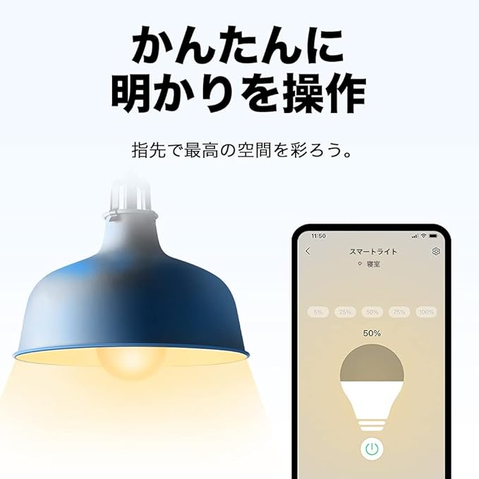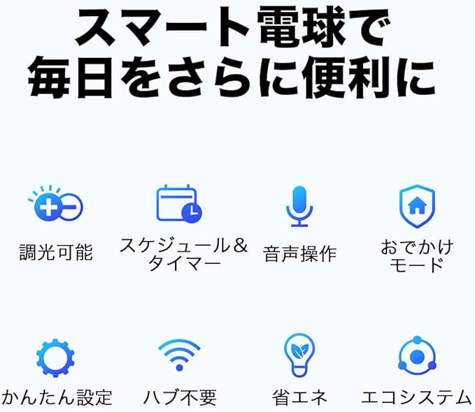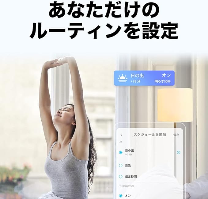 Tapo L510E 新製品 スマート調光LEDランプ かんたんに光を調節 – 照明を調整して、お家のムードを指先ひとつで一変させましょう。 お気に入りの設定を保存 – 例えば映画鑑賞に最適な照明の明るさを編み出したら、その時の状態を保存して映画のお供としてワンタッチで設定が可能です。 お好みのスケジュールを設定 – お好みの明るさで、お好みの時間に照明のオン/オフが設定可能です。 日の出日の入りのあわせて – 利用地域の日の出と日の入り時刻をスケジュールとして利用可能です。 音声アシスタントに対応 – Amazon AlexaとGoogleアシスタントに対応しているので、声で照明を操作可能です。 遠隔操作 – スマートフォンアプリからランプの遠隔操作が可能です。 おでかけモード – ランプのオン/オフを無作為に切り替えて、家主の不在を悟られないようにします。